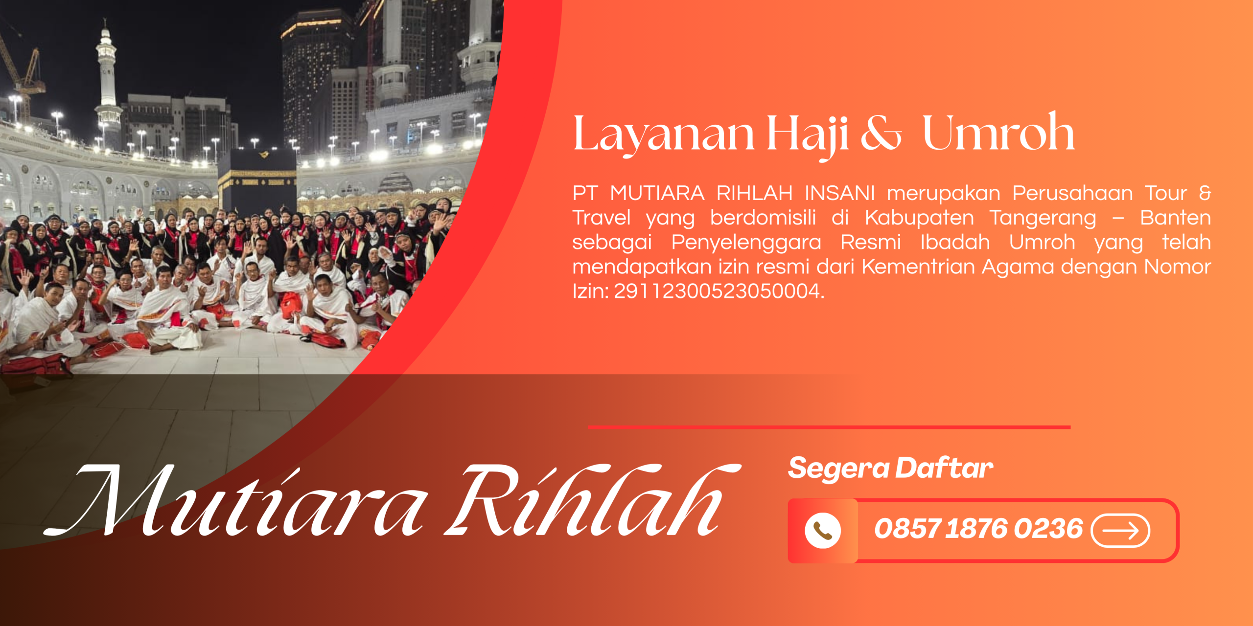 PT MUTIARA RIHLAH INSANI merupakan Perusahaan Tour & Travel yang berdomisili di Kabupaten Tangerang sebagai Penyelenggara Resmi Ibadah Umroh Yang Telah Mendapatkan Izin Resmi dari Kementrian Agama dengan Nomor Izin : 29112300523050004. PT MUTIARA RIHLAH INSANI berdiri sejak tahun 2012 dan sudah memberangkatkan kurang lebih 3000 Jamaah. Sebagai Perusahaan Tour & Travel yang berpengalaman, kami juga mempunyai tim yang berpengalaman dan professional maka dari itu kami selalu memberikan pelayanan terbaik bagi para calon Jamaah Umroh Mutiara Rihlah.